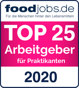 Laut einer Studie von foodjobs.de gehören wir 2020, 2021, 2023, 2024 und 2025 zu den Top 25 Arbeitgebern für Praktikanten in der Lebensmittelbranche. Die Auszeichnung basiert auf den Aussagen von (ehemaligen) Praktikantinnen und Praktikanten.