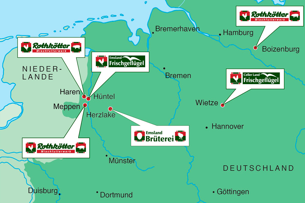Zur Rothkötter Gruppe gehören mehrere Unternehmen, die alle auf bestimmte Gebiete in unserer Wertschöpfungskette spezialisiert sind. Ob Brüterei, Mischfutterwerke, Hähnchenverarbeitungsbetriebe, LKW-Werkstatt oder der Vertrieb unserer Produkte – alle Unternehmensteile arbeiten eng zusammen.